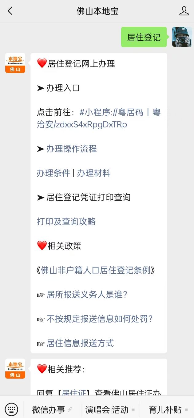 温馨提示:微信搜索关注【佛山本地宝】公众号,发送【居住登记】即可获取佛山居住登记办理入口+办理流程、条件、材料......