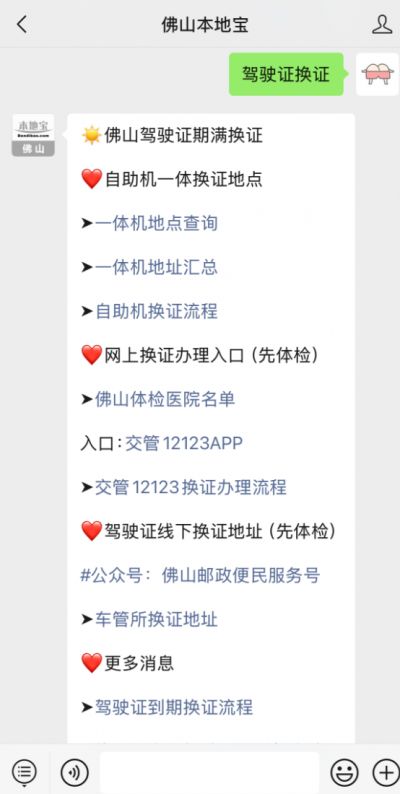 识别上方二维码关注【佛山本地宝】公众号,关注后在对话框回复【驾驶证换证】获取佛山驾驶证换证办理入口/流程+体检医院名单+自助一体机地址查询等...
